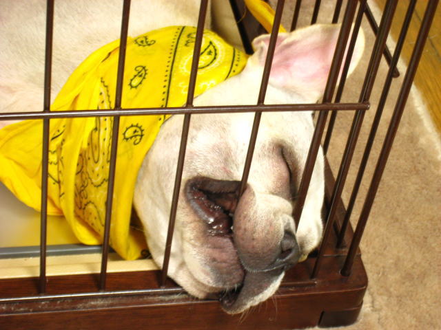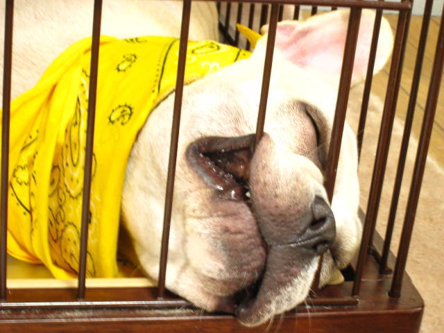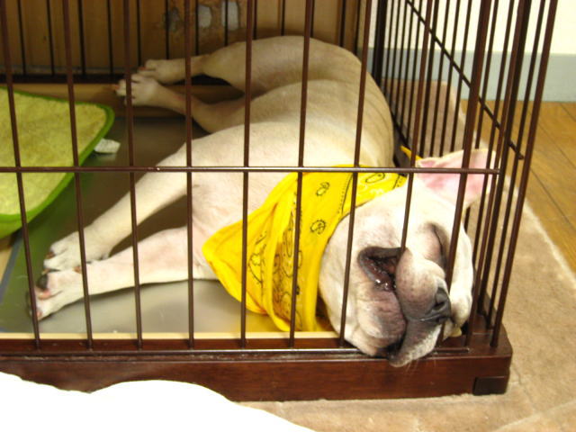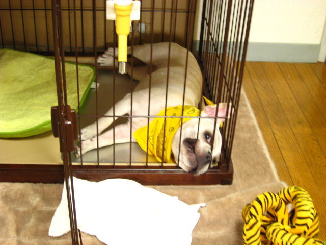 今のワンコ業界じゃ、柵を噛みながらクールダウンが流行ってるのか?