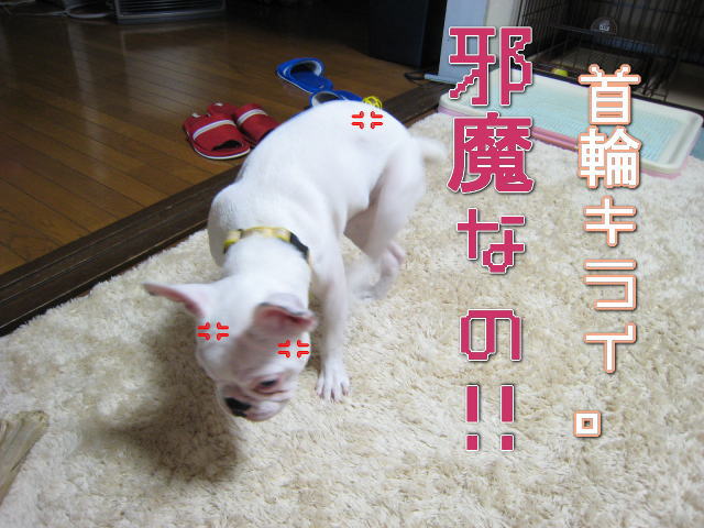首輪に馴染めず、やっさんみたいにガニ股になりながら
